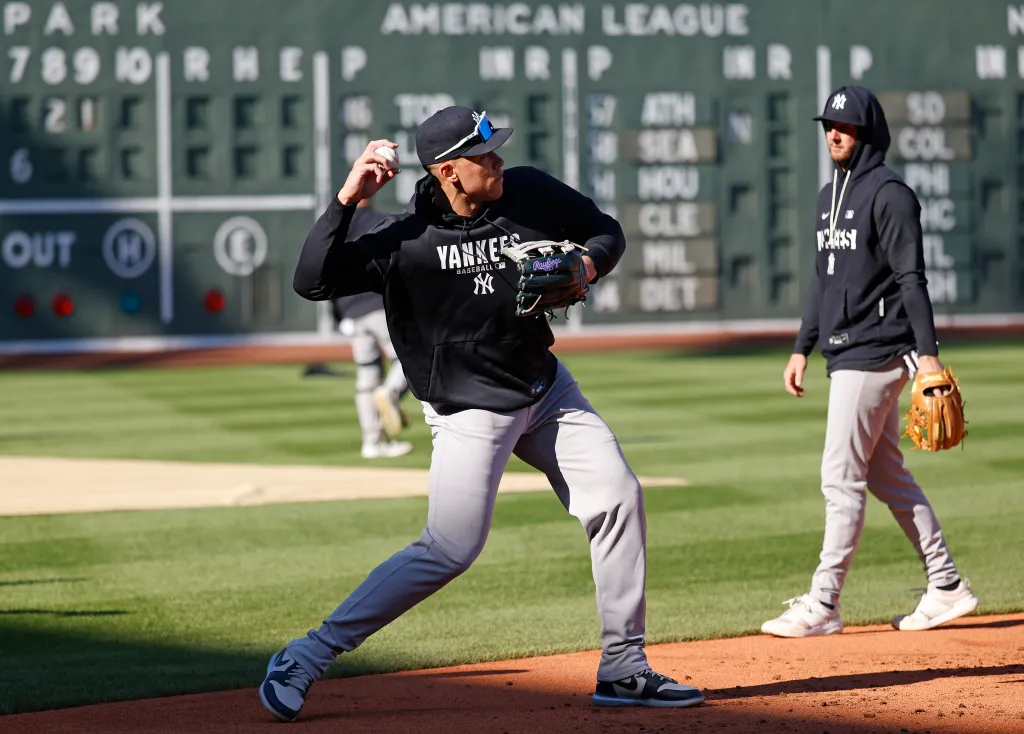 The Yankees slugger took some reps at third base during warmups ahead of Tuesday’s series opener against the Red Sox at Boston’s Fenway Park.