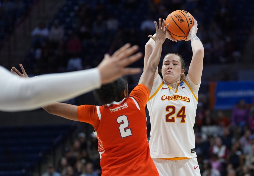 An Iowa State player in a white and gold jersey shoots a basketball while a Syracuse player in an orange jersey defends.