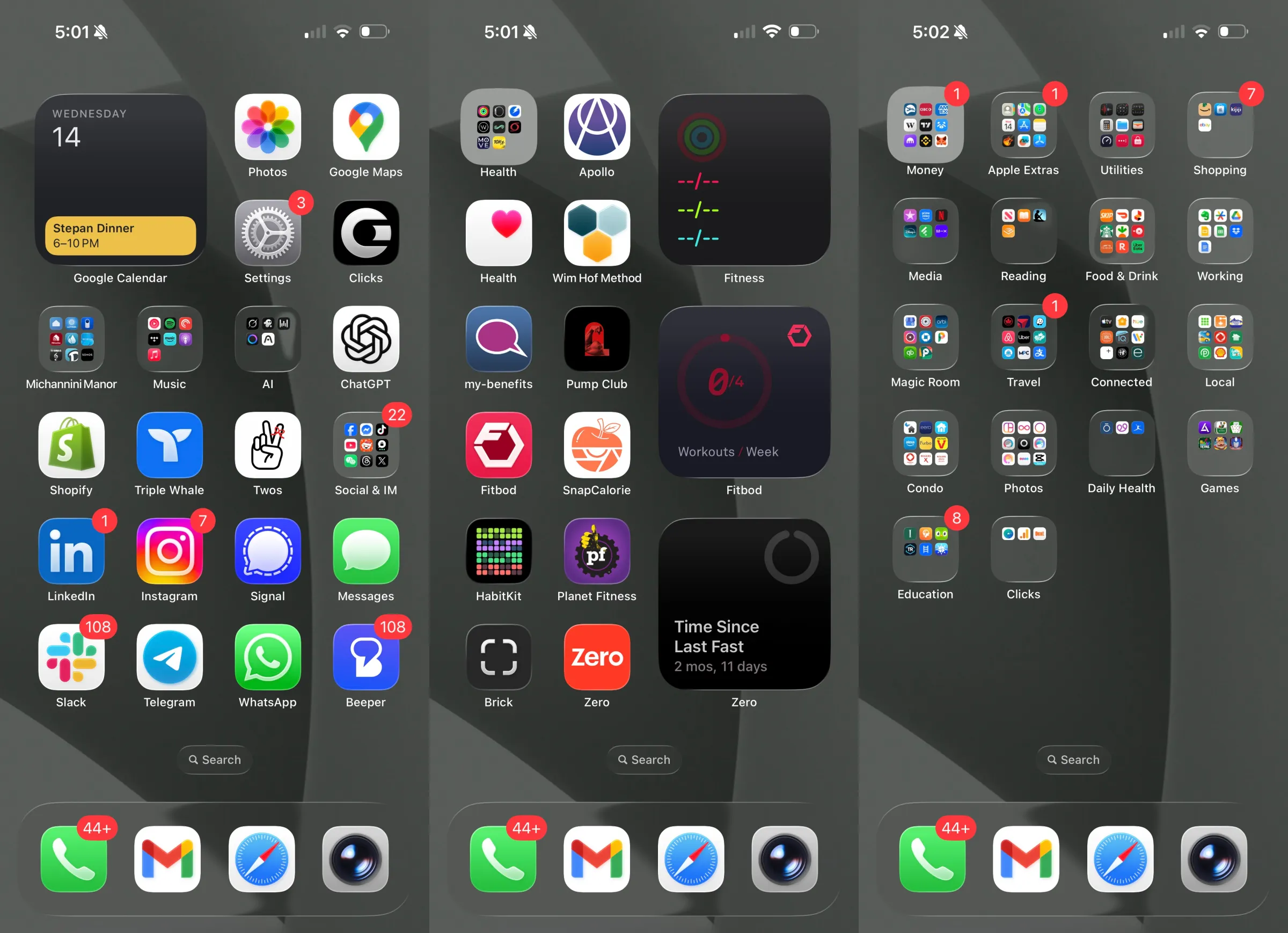 The apps: Photos, Google Maps, Clicks, ChatGPT, Shopify, Triple Whale, Twos, LinkedIn, Instagram, Signal, Messages, Slack, Telegram, WhatsApp, Beeper, Phone, Gmail, Safari, Camera.