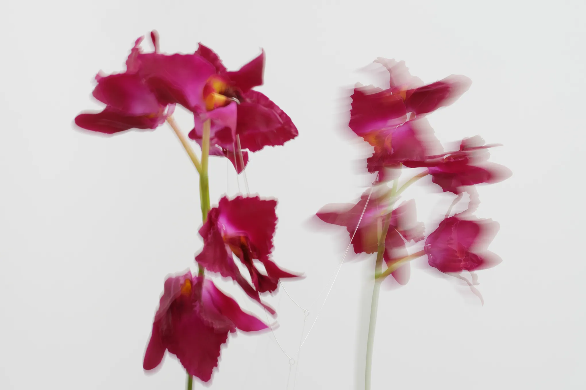 Slow Burn is made from an artificial orchid, a neck massager, bits of metal that clamp the orchids’ petals, and a monitor mount attaching the entire apparatus to a gallery wall. A motor on the massager animates metal rods that force the orchid open and close, a visual that feels caged in its sexuality, a flower forced to furl and unfurl infinitely for the viewer. Its repetitive movements allude to the way a person can become trapped in a comforting loop, endlessly rotating on a circular path of self-destruction. Youn even remarks on the way their sculptures have a lifecycle of their own, with motors burning out and mechanical hardware grinding itself into nothing inside galleries.