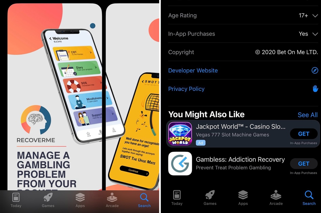 The issue got attention on Twitter early Wednesday when an ad for “Jackpot World” appeared as a suggested app below RecoverMe, an app designed to help users recover from a gambling addiction.