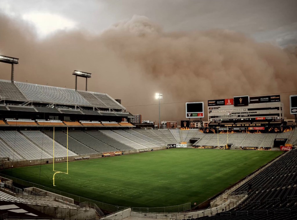 A towering cloud of dust enveloped Mountain American Stadium in Tempe Monday, blocking out daylight on the Sun Devils’ home field, shocking footage posted on social media by the team shows.
