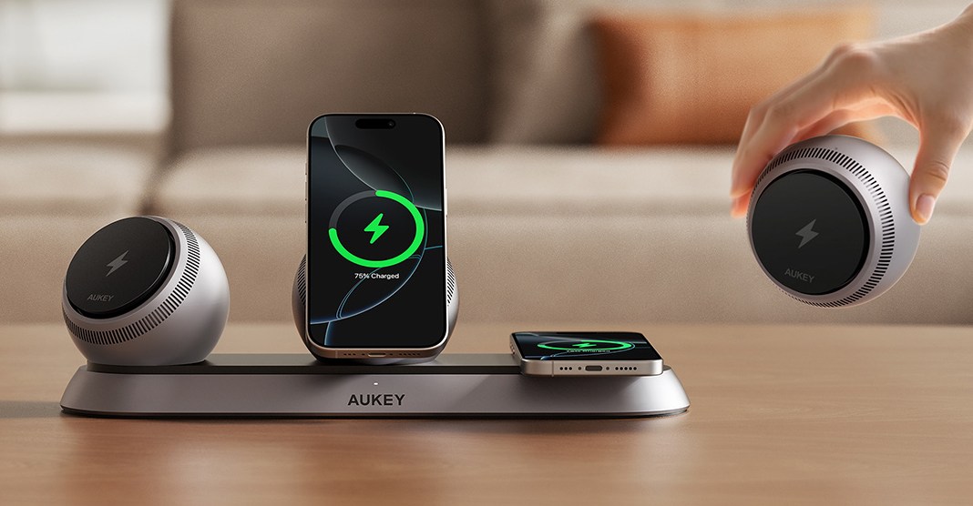 Aukey has announced a new modular charging solution called the MagFusion Ark. It combines a base station featuring up to three Qi2.2 charging pads with spherical power banks that each have their own Qi2.2-compatible pads. The spheres support passthrough charging and can wirelessly charge another device while they’re on the base station, but they can also be removed and used as standalone wireless chargers powered by either their 6,700mAh battery or a USB-C port.