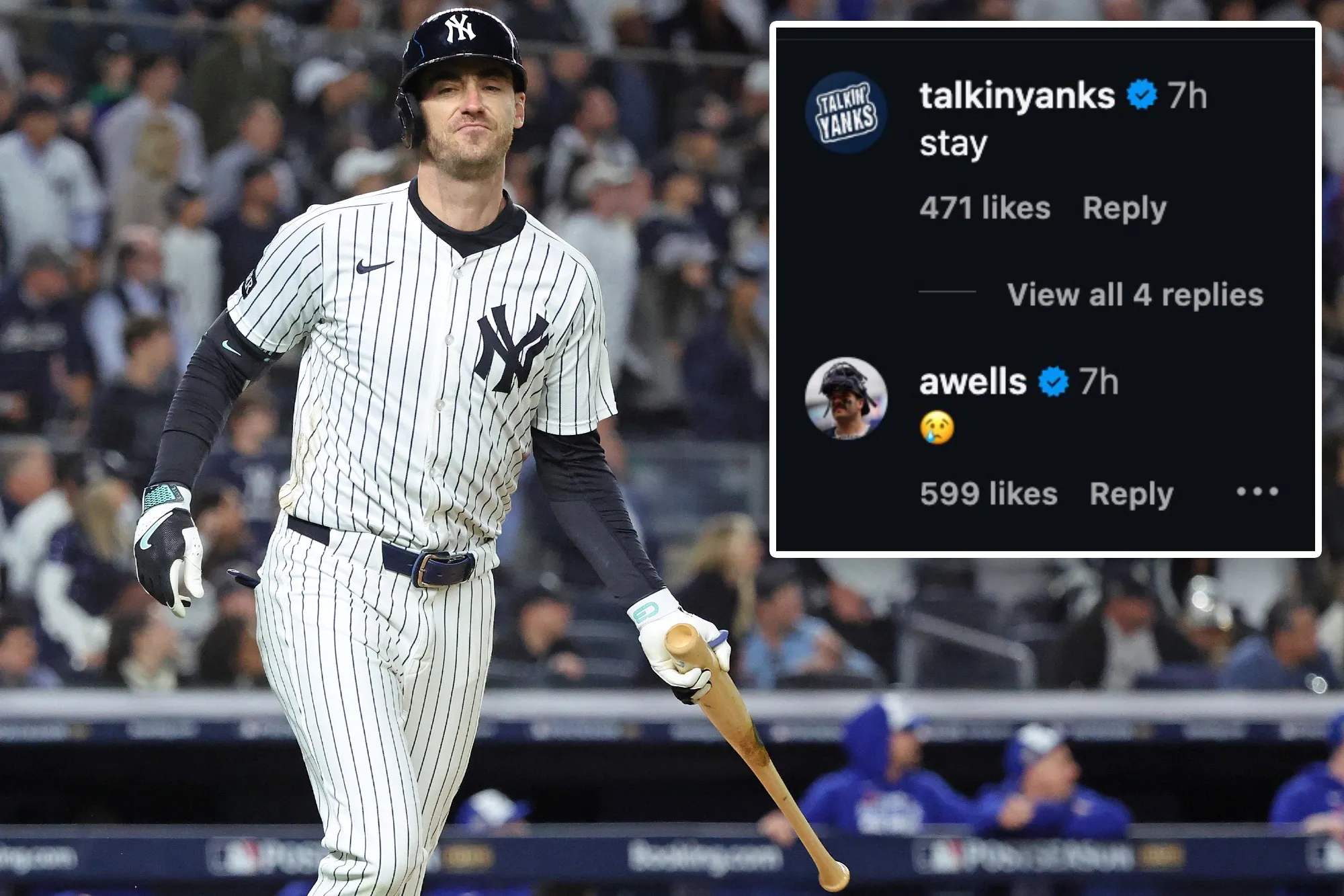 Austin Wells replied to Cody Bellinger’s latest Instagram post with a crying face emoji as rumors swirl about the star’s looming free agency decision.