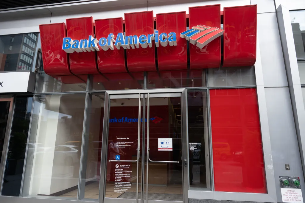 Exterior of a Bank of America branch in New York City with a prominent red sign and logo.