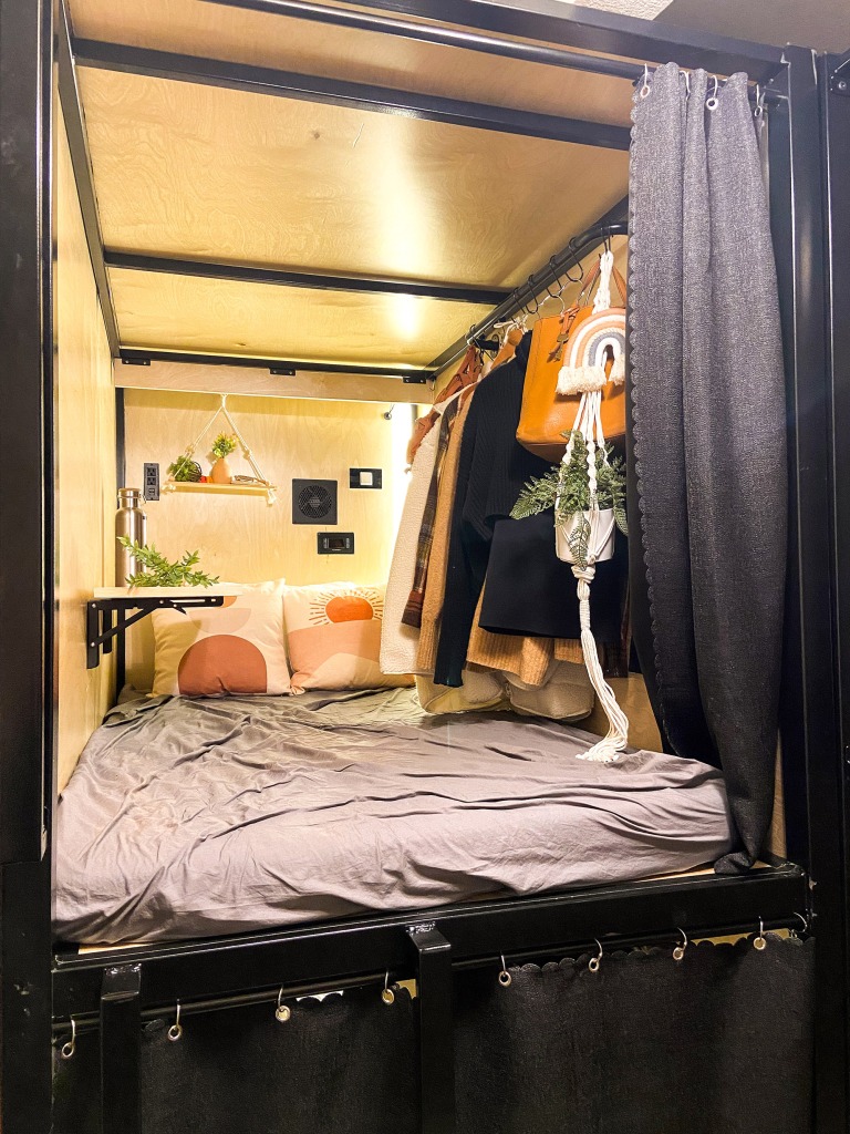 The pods are “fully equipped” with electrical outlets, shelves for books, a rack from which one can hang clothes and laundry, hooks to hang plants and other decorations, and black curtains at the end of each pod for privacy.