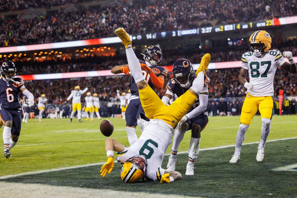 Chicago Bears cornerback Nahshon Wright (26) helps takes down Green Bay Packers wide receiver Christian Watson (9), who fumbles the ball just short of the end zone on Jan. 10, 2026.
