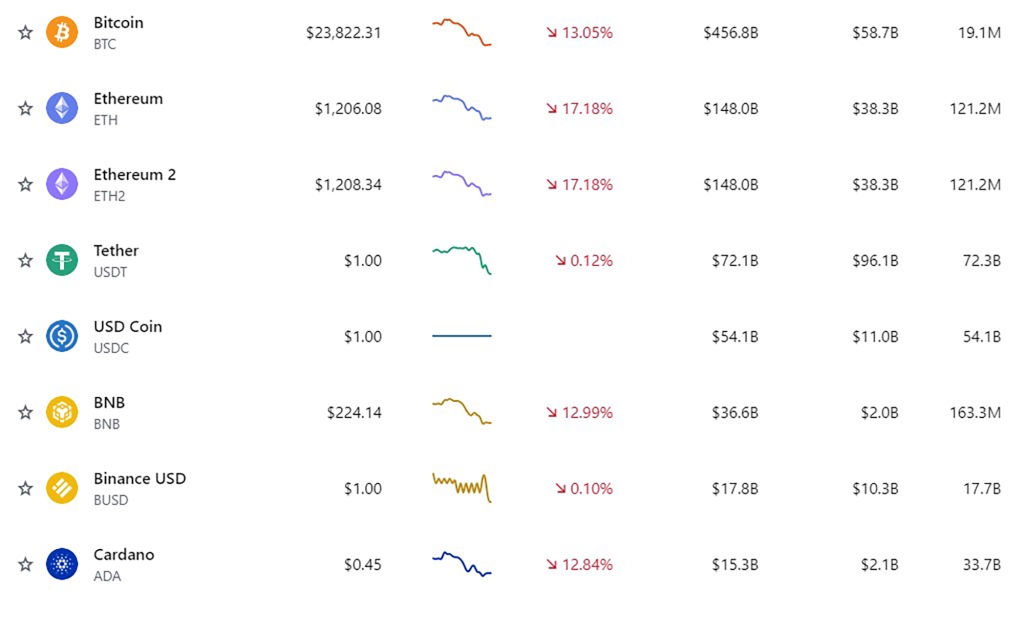 Bitcoin, the largest cryptocurrency, fell more than 13% early on Monday morning. It was trading at $23,822.31, according to Coinbase.