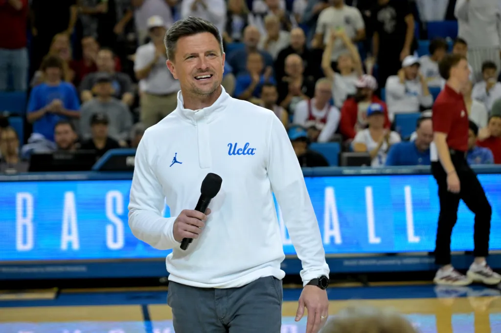 UCLA Bruins head football coach Bob Chesney holds a microphone at a basketball game.