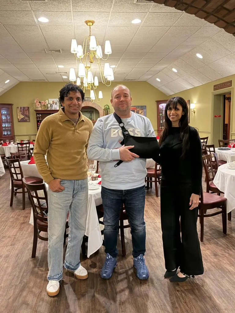 M. Night Shyamalan with Ahmed al-Ahmed and a woman in a restaurant.