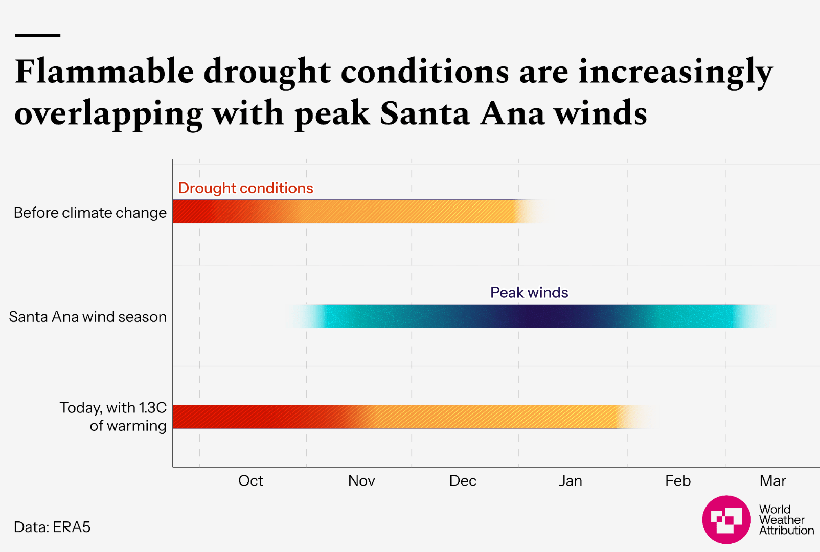 The length of the dry season in the region has already grown by about 23 days, according to the researchers. That increases the chances of arid weather coinciding with the powerful Santa Ana winds that typically pick up in cooler months.