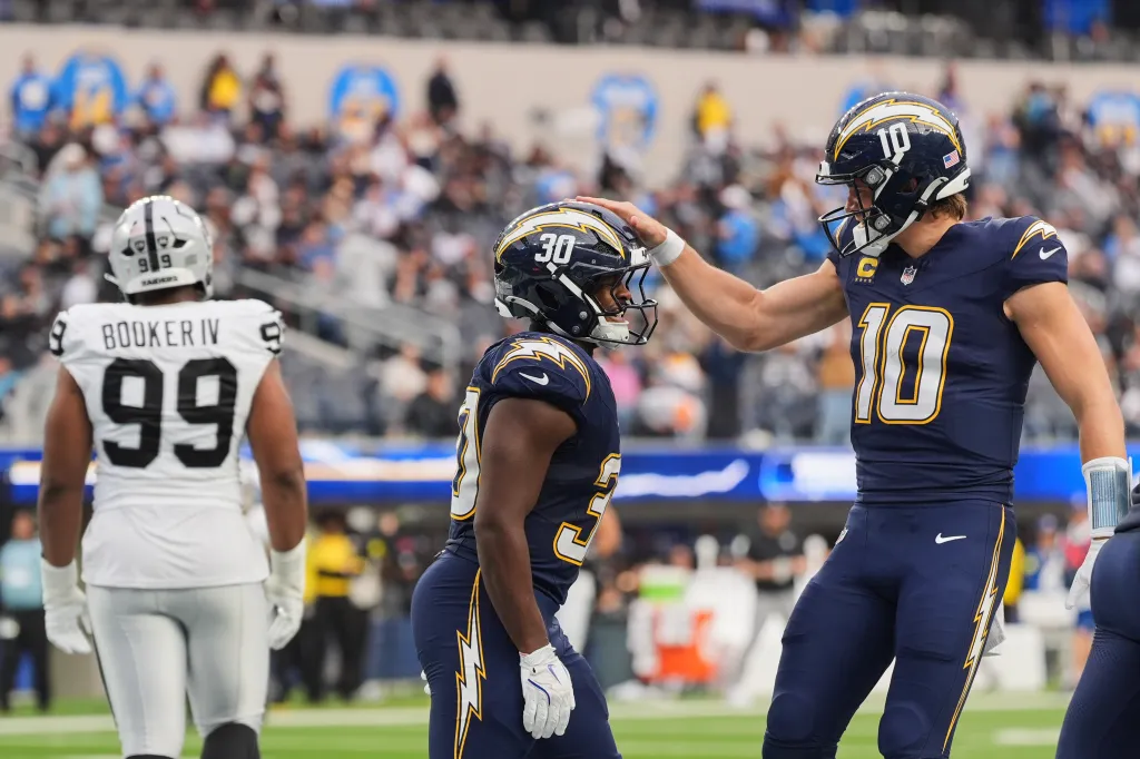 Kimani Vidal (30) and Justin Hebert (10) during the Week 13 win over the Raiders. AP