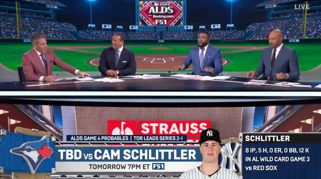 On the postgame show following the Yankees’ 9-6 comeback Game 3 win against the Blue Jays, David Ortiz, Alex Rodriguez, and Derek Jeter were asked how they pronounce rookie right-hander Cam Schlittler’s name, when the former Boston Red Sox all-time great joked, “It sounds like Hitler.”