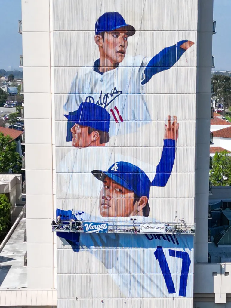 The mural is entitled “Samurai of the Diamond,” featuring the three Japanese Dodgers players Shohei Ohtani, Yoshinobu Yamamoto, and Roki Sasaki. The mural is located alongside the 12-story high side of the DoubleTree Hotel and is a towering tribute to the three foreign-born superstars who helped deliver a World Series title for the Dodgers in 2025.