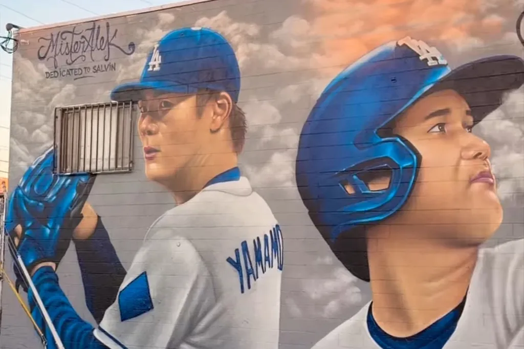 Painted by Los Angeles street artist Mister Alek, the massive piece features Shohei Ohtani, Yoshinobu Yamamoto, Mookie Betts, and the late Fernando Valenzuela — four figures who, in different ways, define the mythology of Dodger baseball.