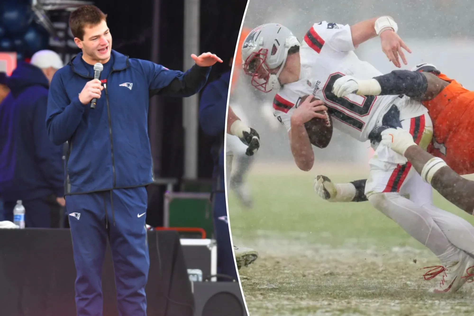 Quarterback Drake Maye took the stage in frigid Foxborough, hyping up the crowd just two days after missing practice due to illness and injury.