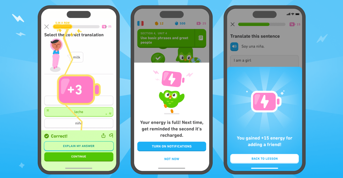 Wayne points out that, under the hearts system, you could fail out of your first lesson of the day. “In an energy world, that’s really not going to happen because we’re not penalizing you for mistakes anymore,” Wayne says. Duolingo’s aggregate metrics show that, in general, people are able to engage “a lot more” with Duolingo now than before.