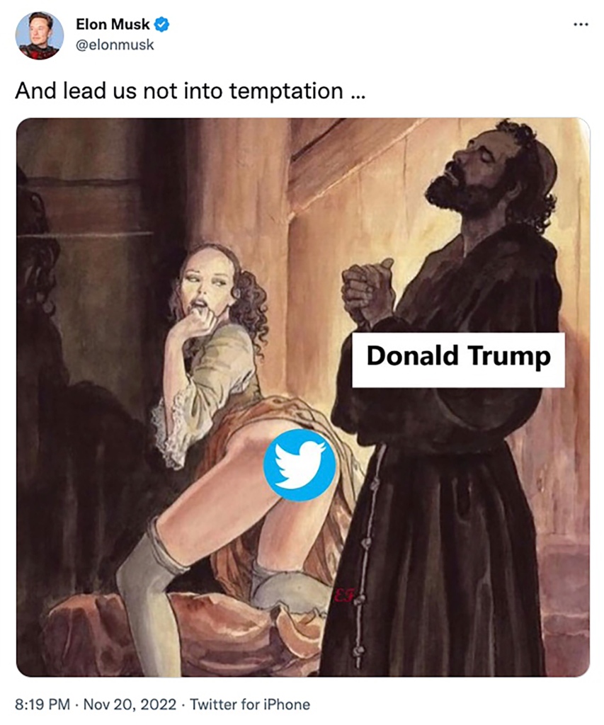 Elon Musk is taunting former President Donald Trump with a crude, sexually charged Jesus meme to suggest he’s struggling to keep away from Twitter.