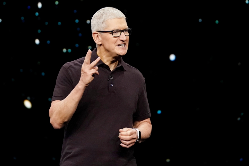 Apple CEO Tim Cook speaks at an Apple event on the campus of Apple’s headquarters on Sept. 7, 2022.