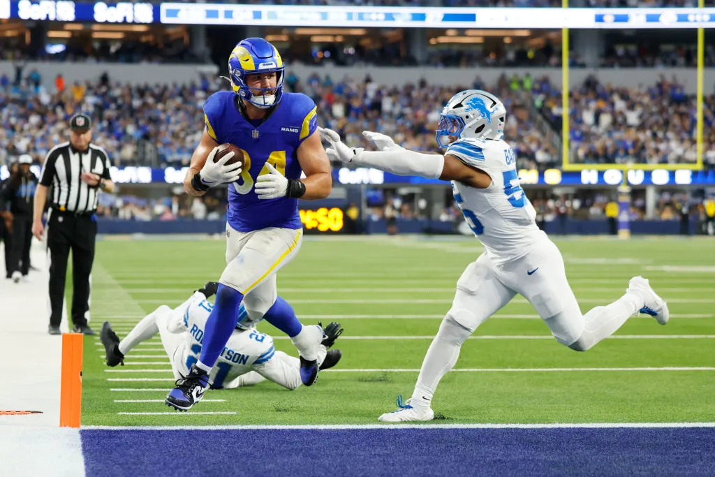 Los Angeles Rams tight end Colby Parkinson (84) scores a touchdown past Detroit Lions linebacker Derrick Barnes (55).