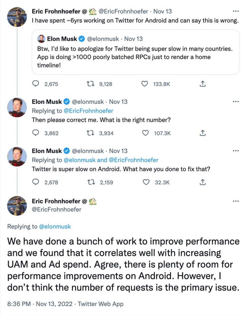 “I have spent ~6yrs working on Twitter for Android and can say this is wrong,” Frohnhoefer replied to Musk. His tweet has received more than 133,000 likes since it was posted.