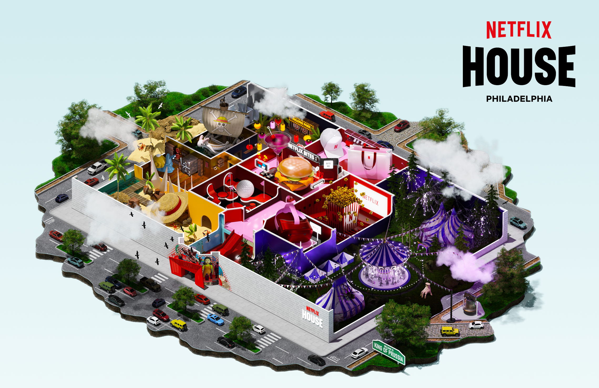 An illustrated view from the top down of the Netflix House Philadelphia showing a variety of themes in different rooms.