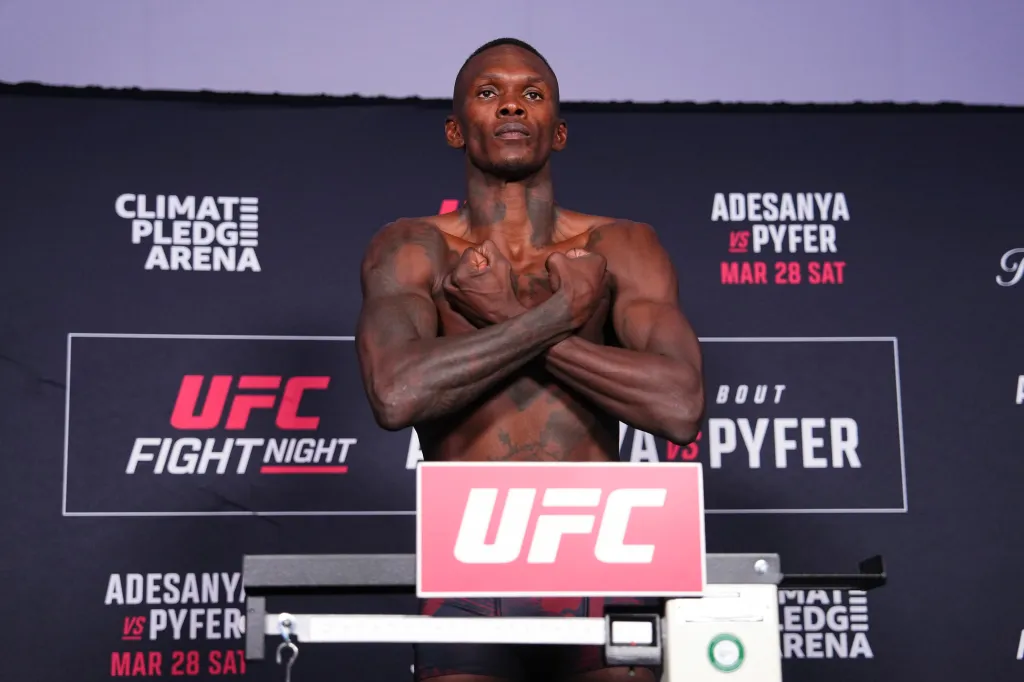 Israel Adesanya on the scale during the UFC Fight Night official weigh-ins for Adesanya vs Pyfer.