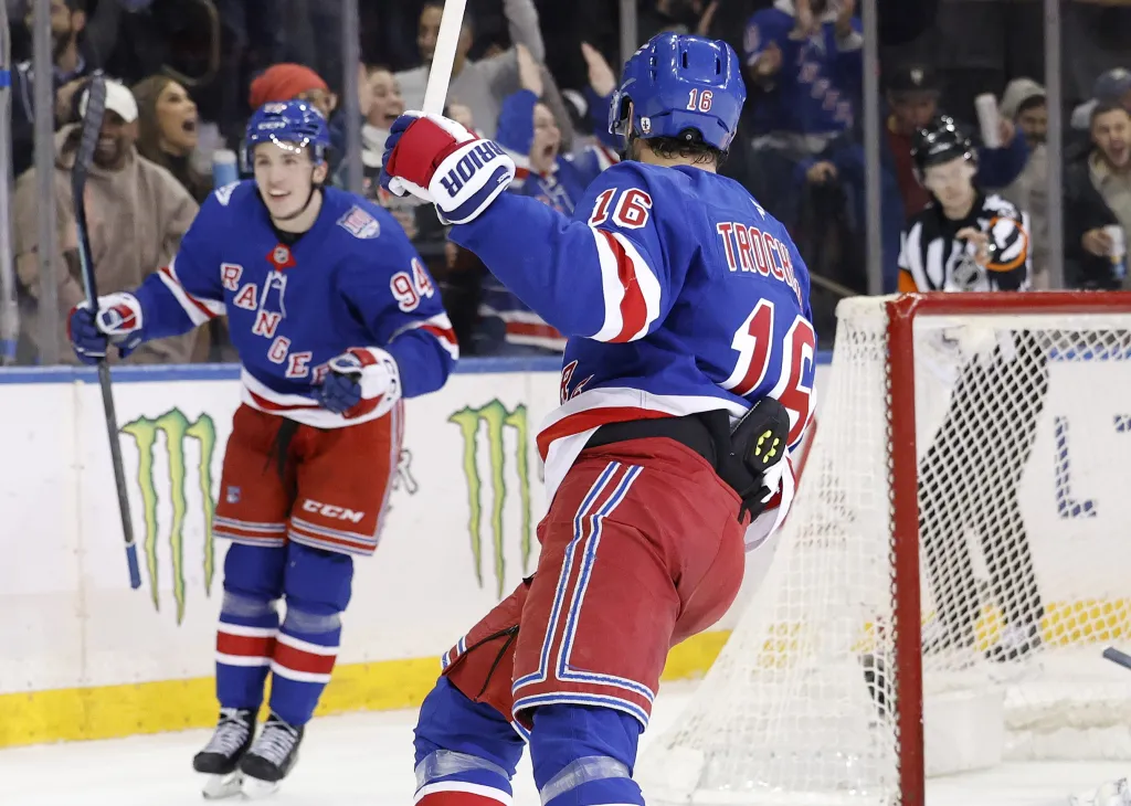 Gabe Perreault (left) celebrates after scoring a third period goal in the Rangers' overtime loss to the Blue Jackets on March 2, 2026.