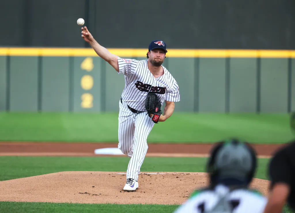 Gerrit Cole pitching during his rehab outing with Double-A Somerset on April 17, 2026.