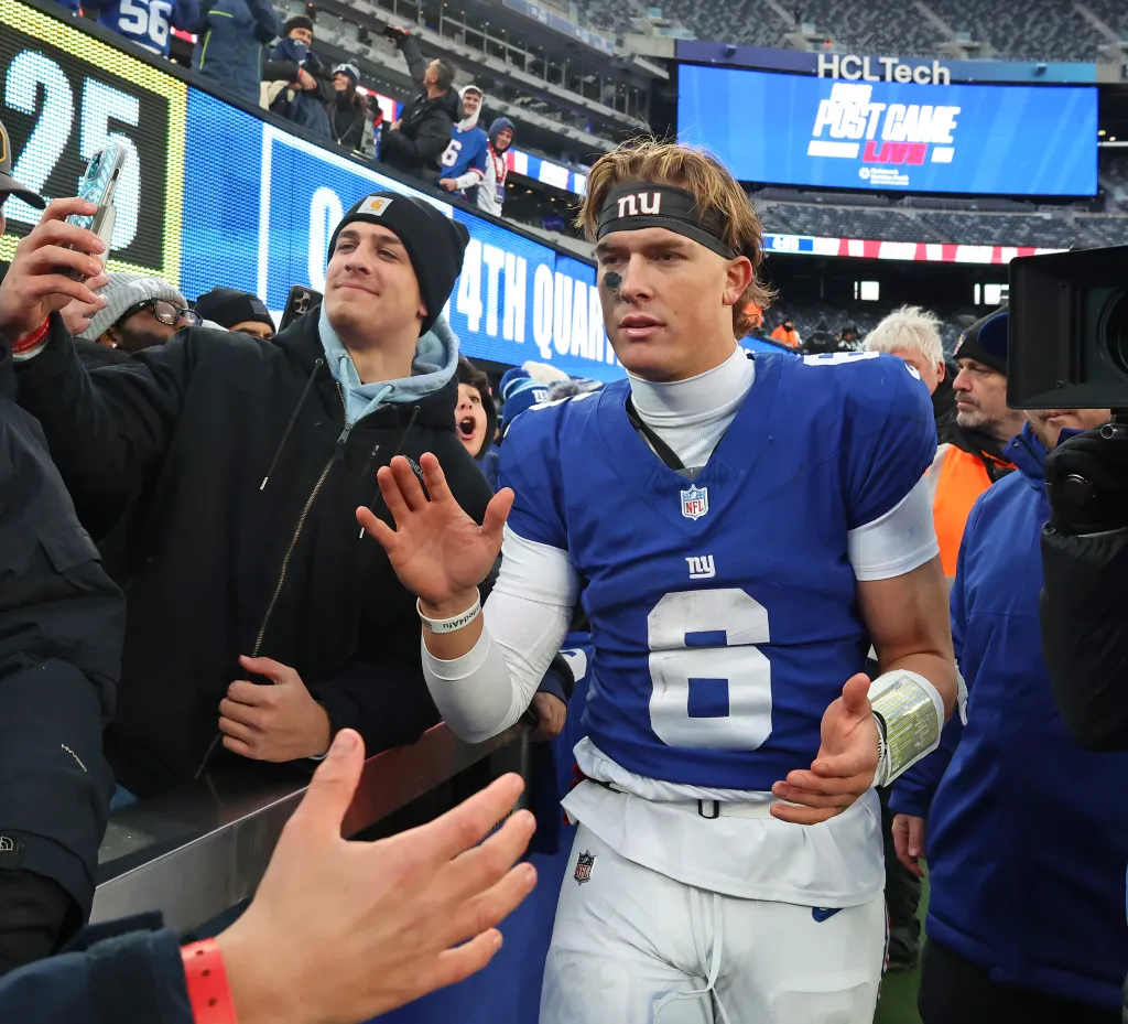 New York Giants quarterback Jaxson Dart (6) high-fives fans after a game.