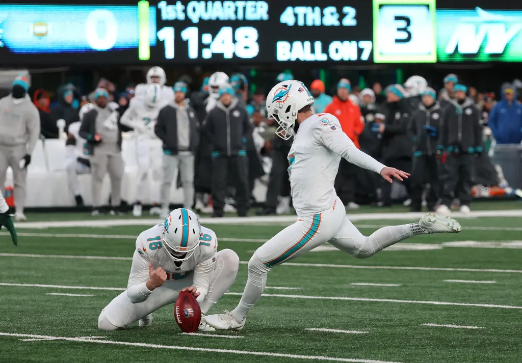 Miami kicker Jason Sanders kicks a field goal during the first quarter of the Dolphins’ win over the Jets in 2025. Charles Wenzelberg / New York Post