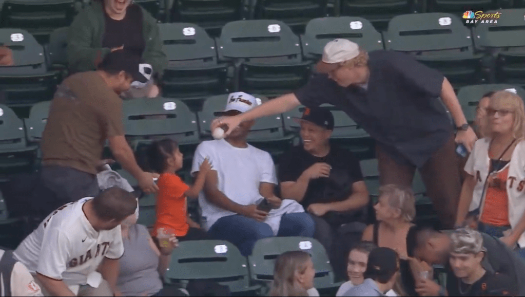 A Giants fan graciously grabs a ball in the stands and gives it to a young female fan. X, @NBCSGiants