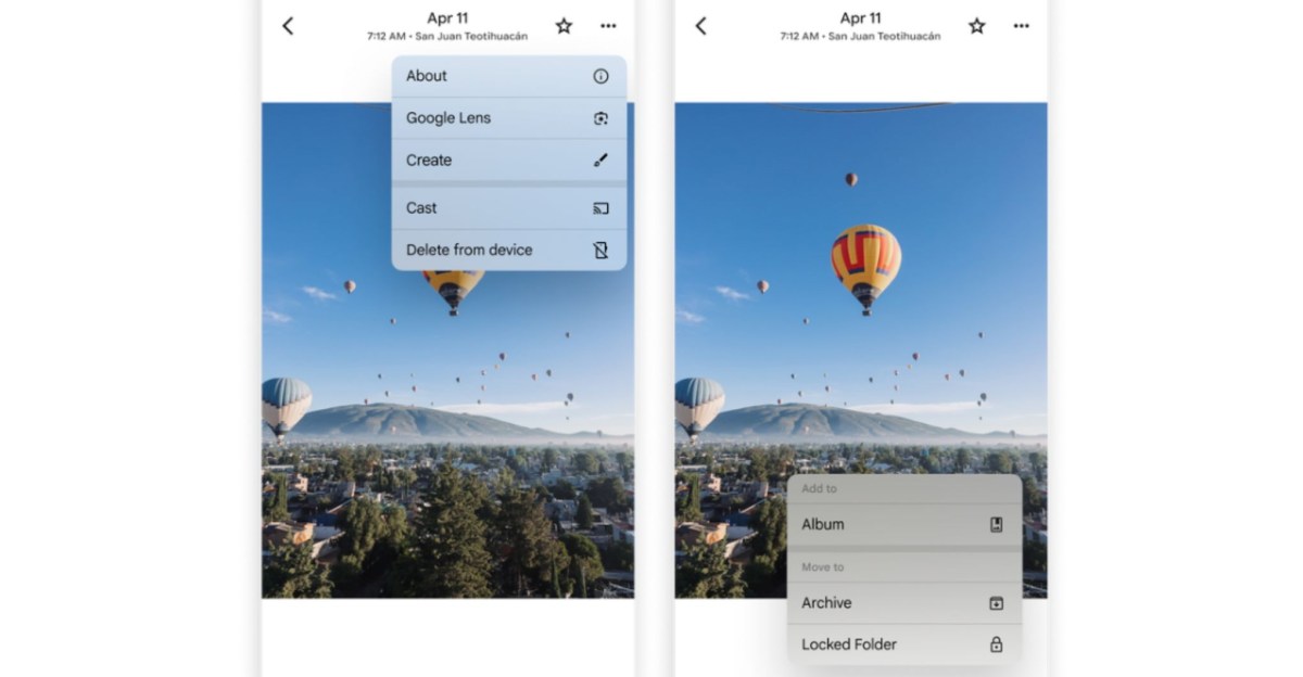 Several actions can now be found under the three-dot menu at the top right of the photo view, including About, Create, Cast, Save as, Download or Delete from device, and Google Lens. The latter was previously located on the photo view taskbar, and has now been replaced with an “Add to” menu that allows users to archive photos, organize them into albums, or secure them in a locked folder.
