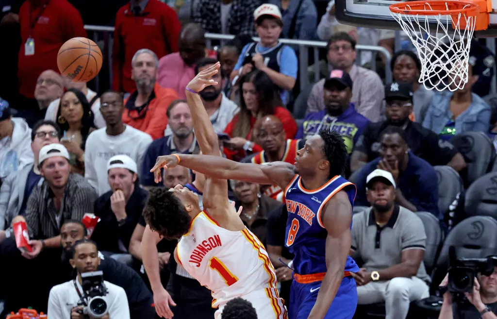OG Anunoby blocks Jalen Johnson's shot during the third quarter of the Knicks' 114-98 Game 4 win over the Hawks on April 25  2026 in Atlanta.