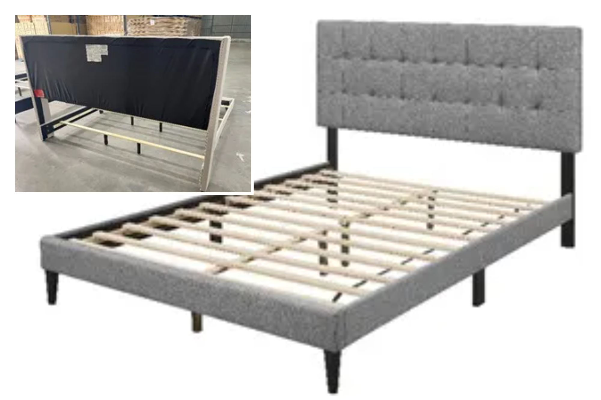 - 80053 is a warm gray bed frame with platform supports which does not require a box spring