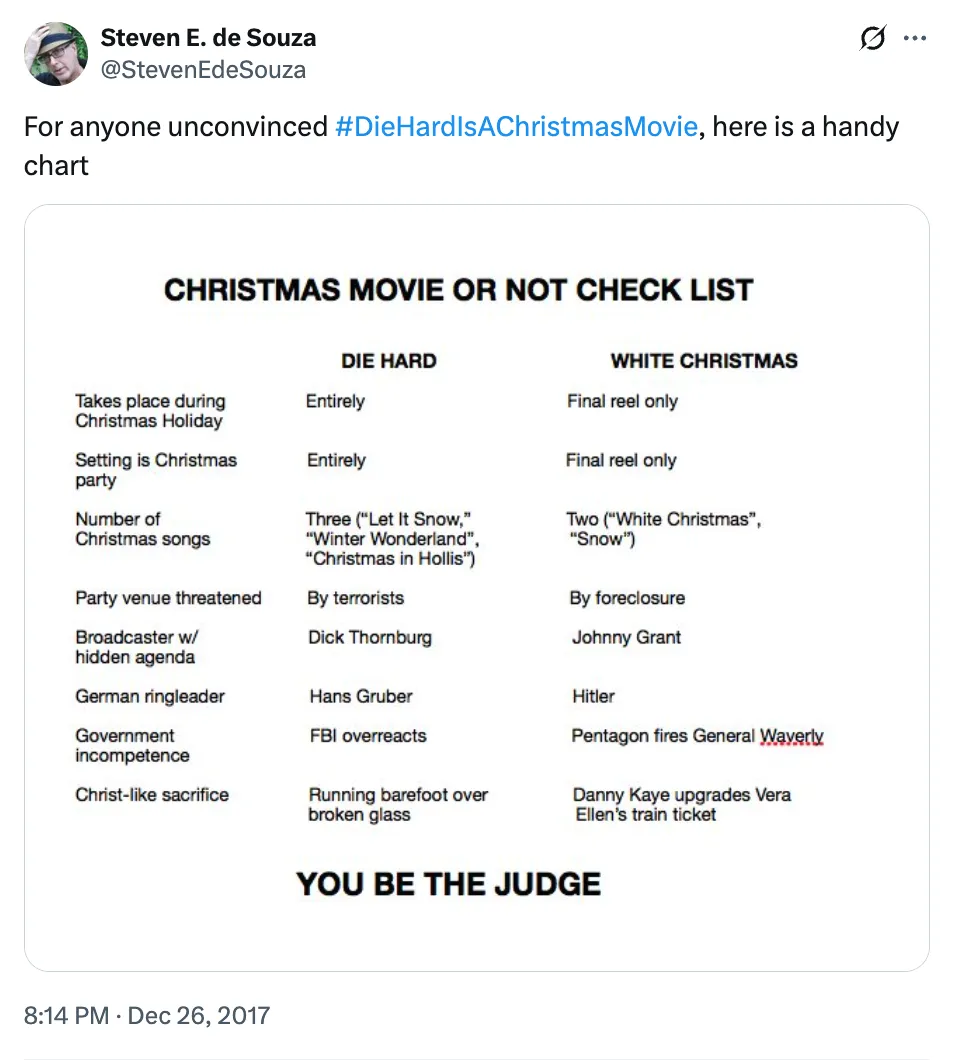 Regulator will be off for the next two weeks for the holidays, and quite fittingly, will return on January 6th. In the meantime, here is a canon position on The Discourse from Die Hard writer Steven de Souza: