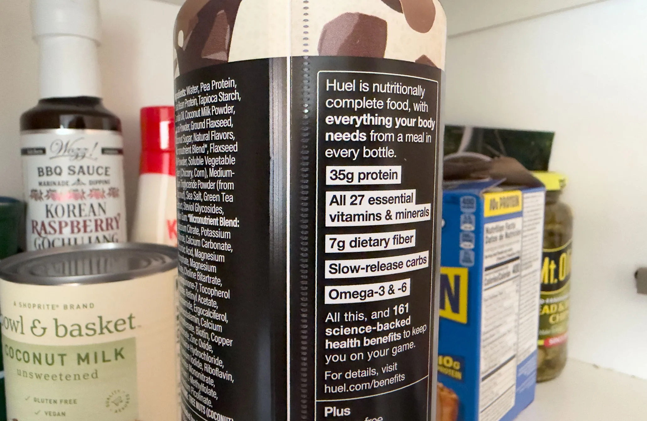 Close up of a Huel bottle’s nutritional label that says ‘Huel is nutritionally complete food with everything your body needs from a meal in every bottle.’ It then lists the macronutrients and says ‘All this, and 161 science-backed health benefits to keep you on your game.’