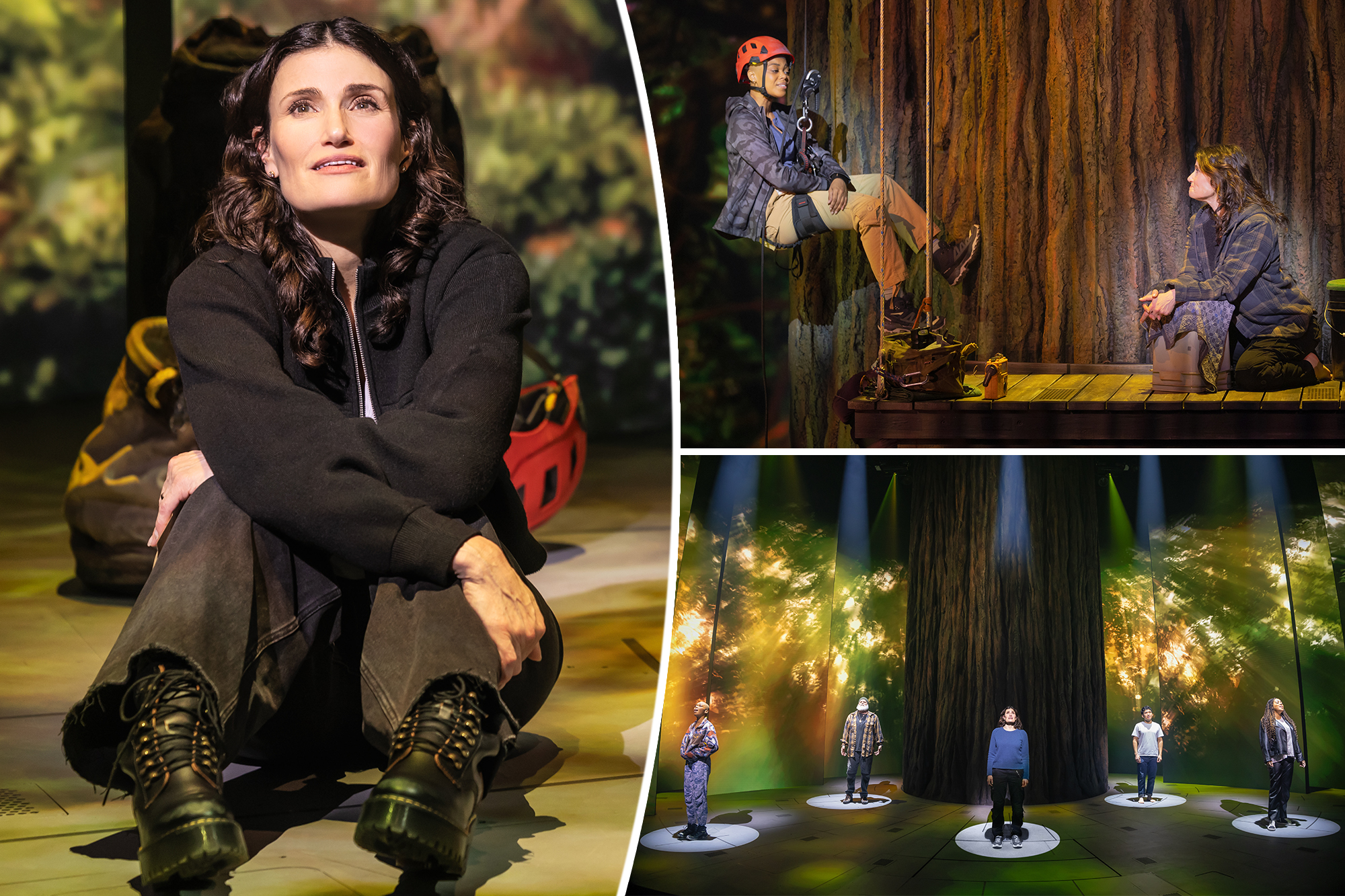 Onstage, the centuries-old conifer enters dramatically like a wooden grande dame and towers over the five actors. The majestic set piece by designer Jason Ardizzone-West is so big, star Idina Menzel and the rest are able to scale it using ropes and harnesses.