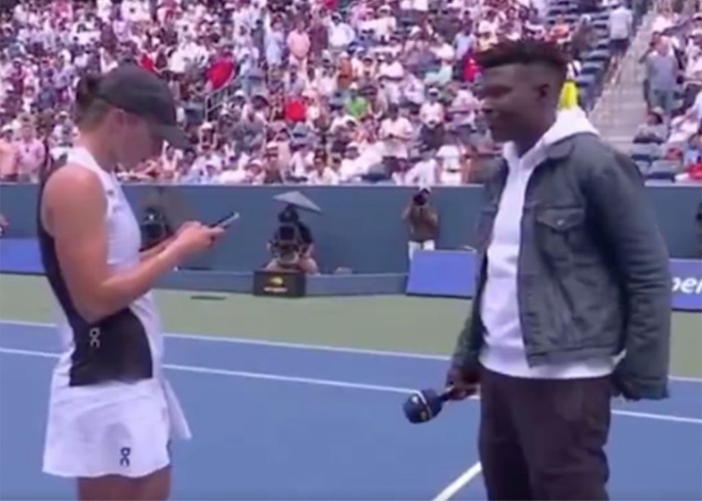 “Do you have any interest in telling us who that text message was going to?” the interviewer said after waiting for Swiatek to finish texting on the court at Louis Armstrong Stadium.