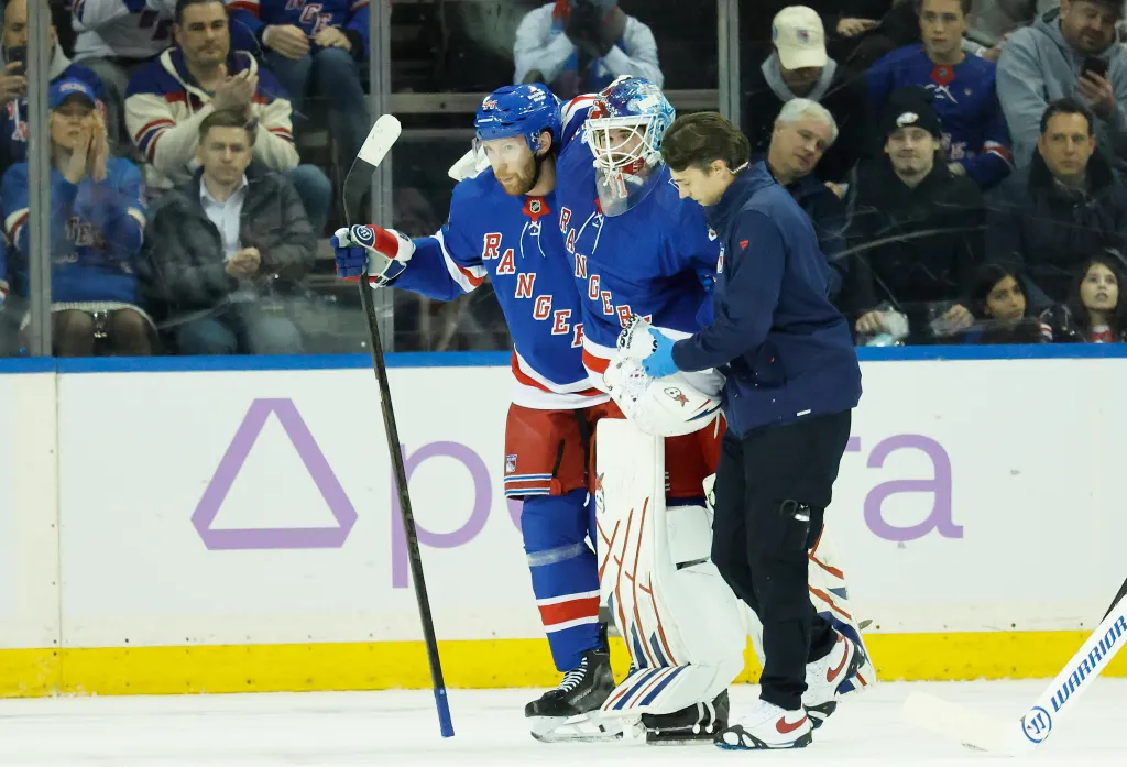 The Rangers’ goaltender went down with a scary-looking injury to his lower body during the first period of Monday night’s loss to the Mammoth.