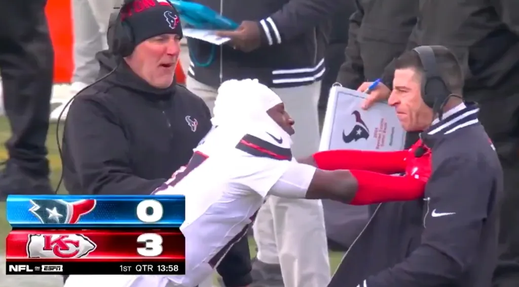He then ran toward the sideline and shoved special teams coach Frank Ross in a moment replayed in slow motion on the ESPN broadcast.