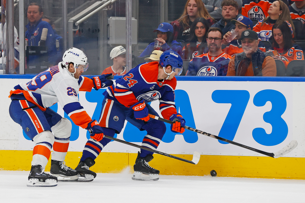 Jonathan Drouin (left) looks to take the puck away from Spencer Stastney during the second period of the Islanders' 1-0 road win over the Oilers on Jan. 15, 2026.