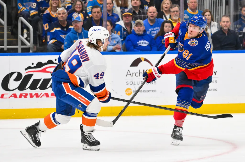 Dylan Holloway shoots and scores as Max Shabanov defends during the Islanders’ win overt the Blues on March 10, 2026. Jeff Curry-Imagn Images