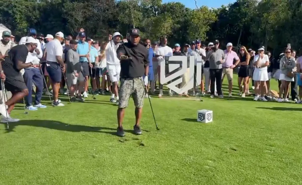 With a sizable crowd around him, Ja Rule took some practice swings while the announcer kept saying, “Ooh,” before tweaking the rapper: “Hey, Ja Rule, where’d you get those calf from?”