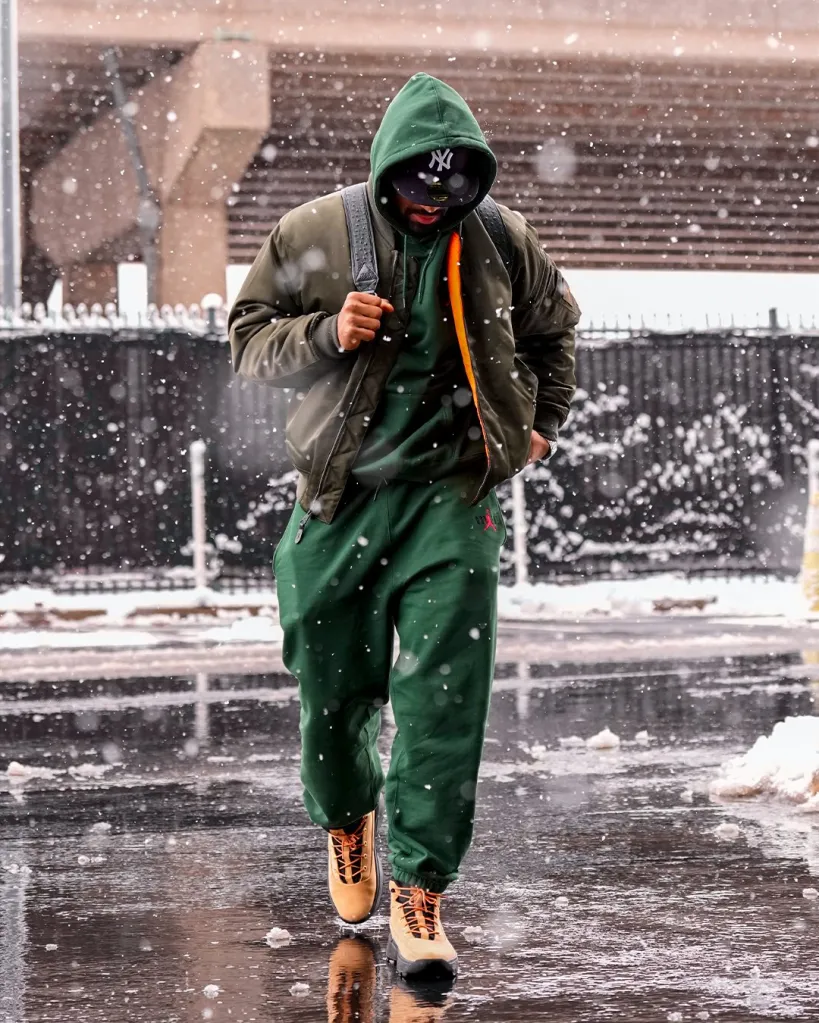 Ahead of Philly’s eventual 31-0 win over the Raiders, the star Eagles quarterback trekked through the snow outside Lincoln Financial Field in green sweats and a bomber jacket, completing the look with a Yankees hat tucked under his hood.