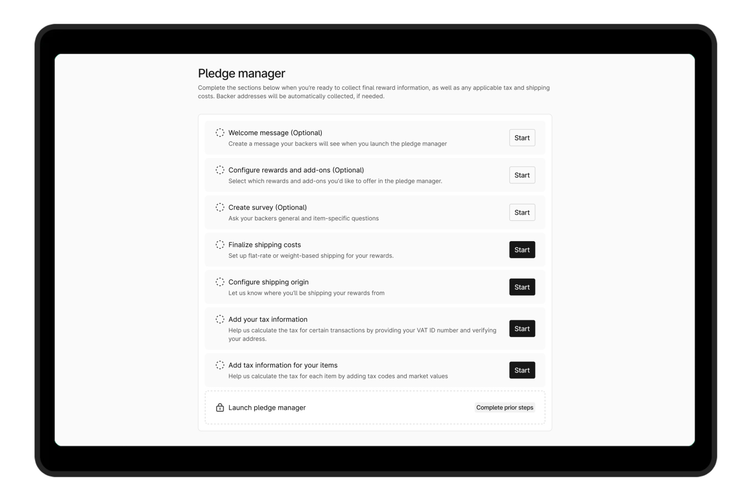 Kickstarter’s Pledge Manager provides more than just tools for raising funds. It can also help creators with the fulfillment process, including shipping, and collecting additional charges like taxes and tariffs.