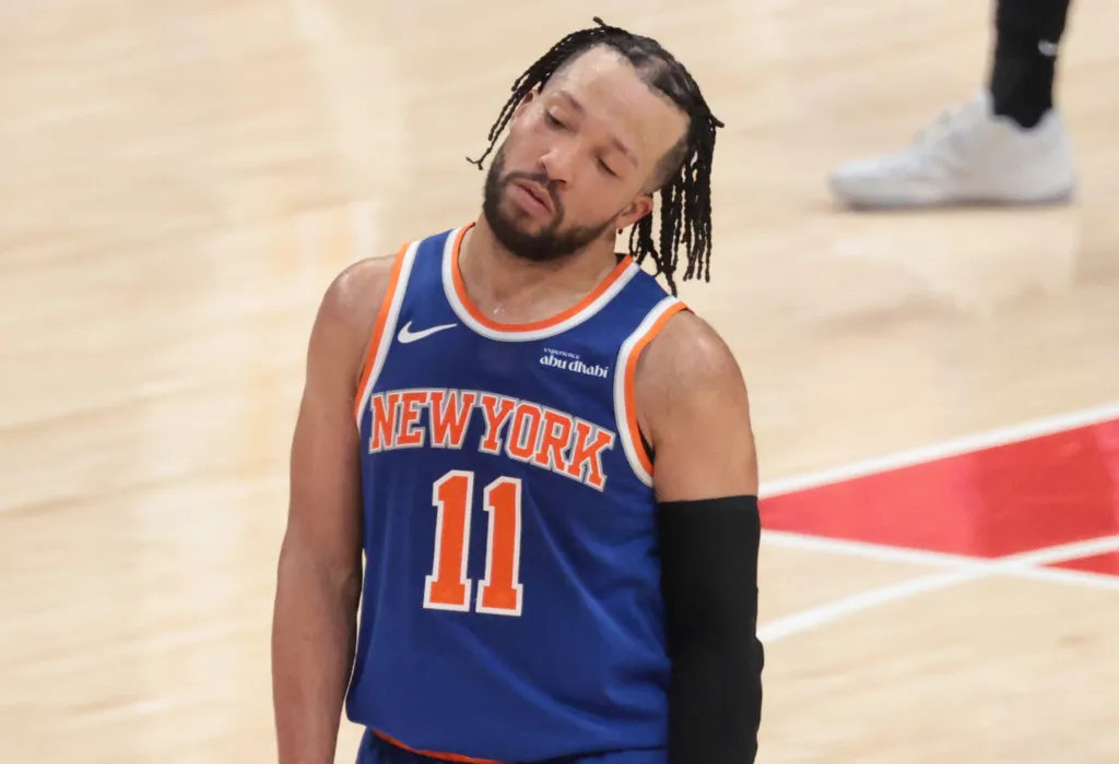 Jalen Brunson gives a frustrated expression during the third quarter of the Knicks' Game 3 loss to the Hawks.