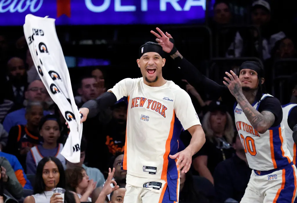 Josh Hart #3 reacts along with Jordan Clarkson #0) after the New York Knicks score a three-point shot. Jason Szenes / New York Post