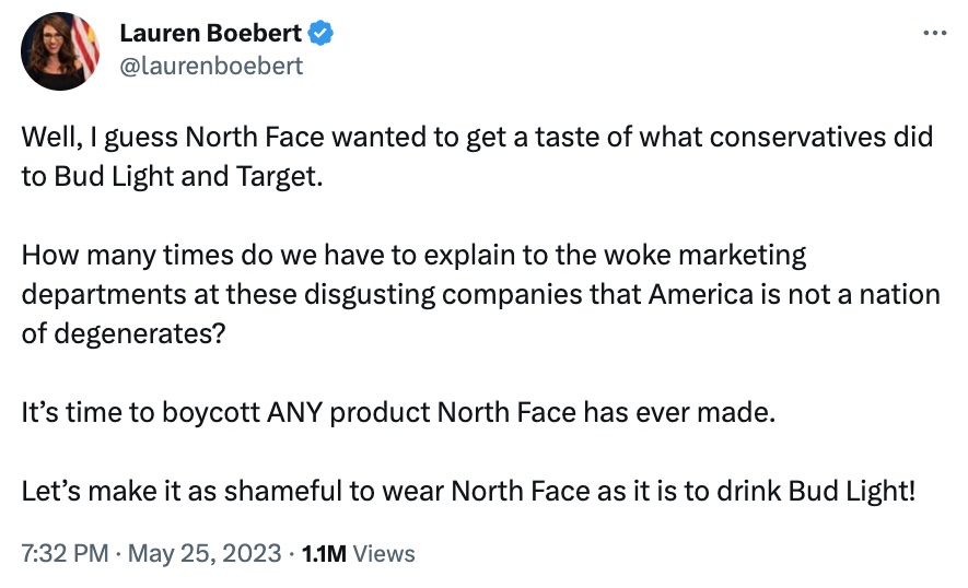 Boebert’s tweet demanding social media users boycott the brand has been viewed more than 1.1 million times since it was posted, with people quick to liken North Face to Bud Light and Target.