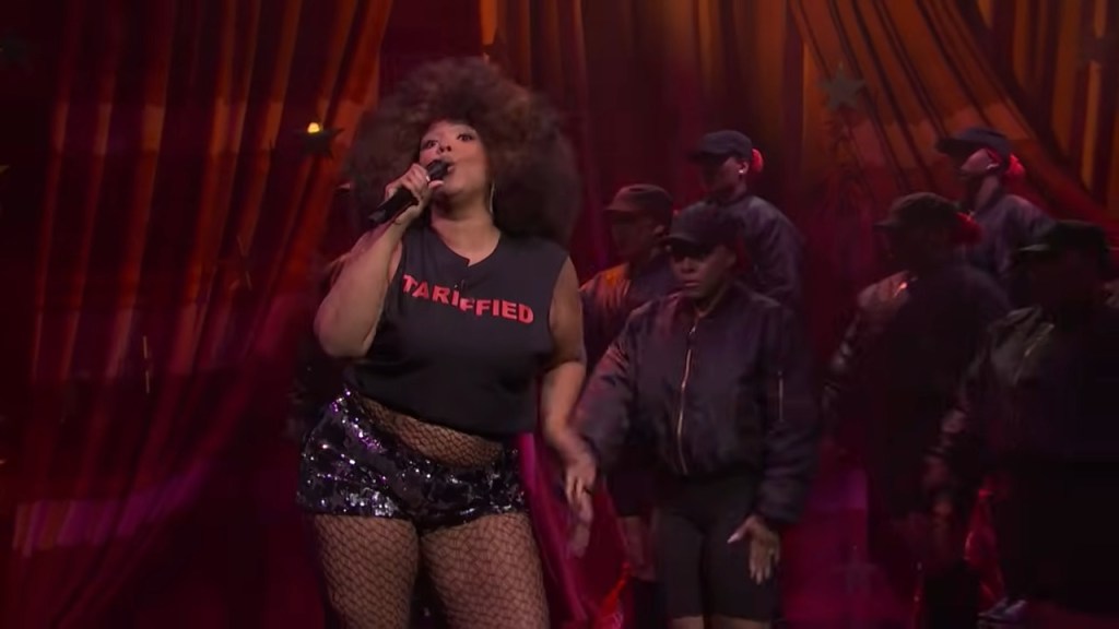Lizzo made a not-so-subtle jab at President Trump’s tariffs during her “Saturday Night Live” appearance this weekend — taking the stage in a shirt that read “TARIFFIED.”